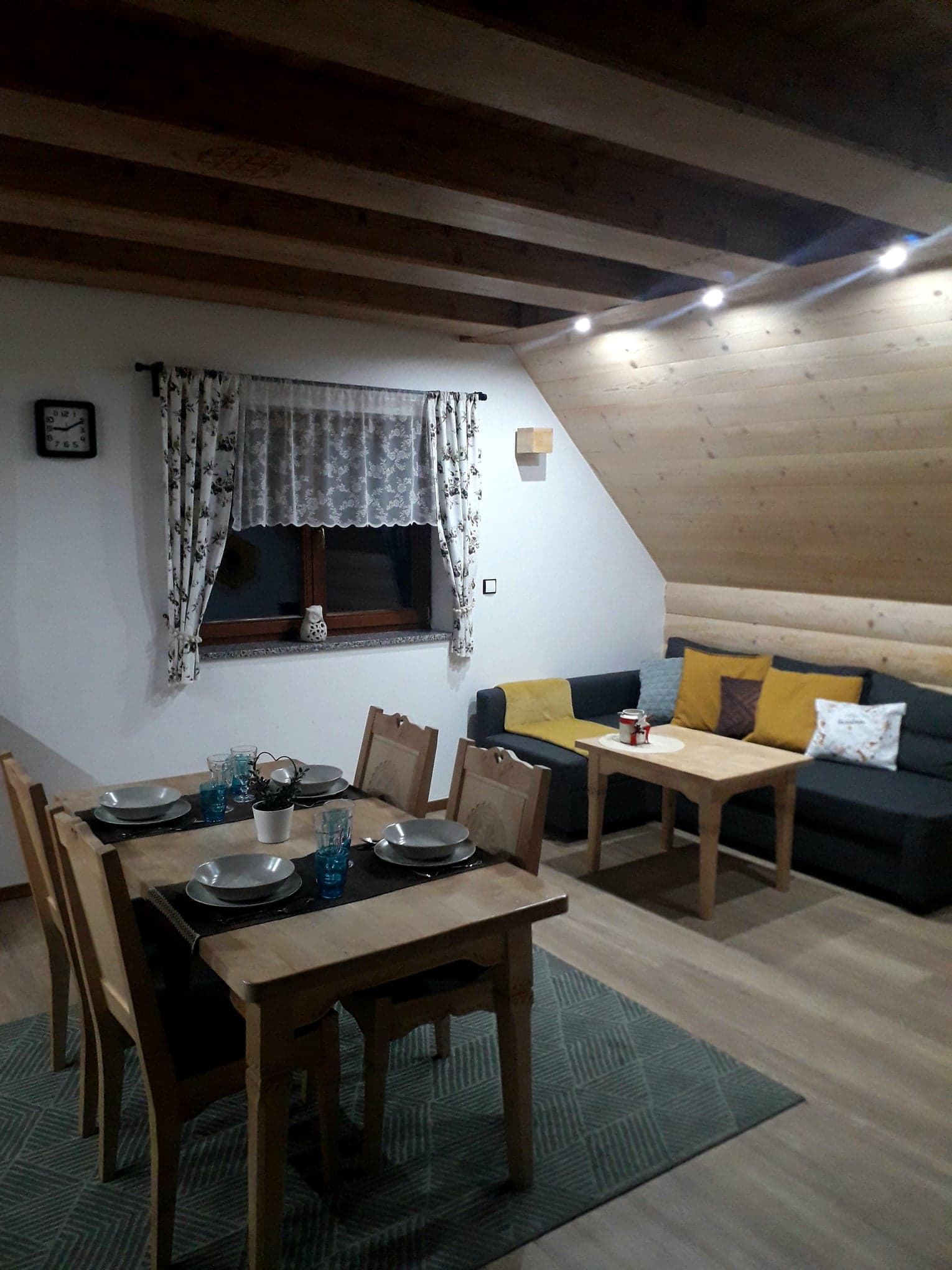 Pokój dla max 4 osób, urządzony w klimacie naszego regionu, wyposażony w ręcznie robione, drewniane meble z góralskimi detalami, posiada wyposażony aneks kuchenny, własną łazienkę, kącik dla dzieci a do części sypialnej prowadzą oryginalne schody.